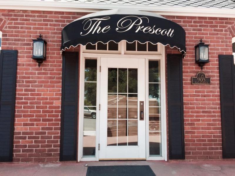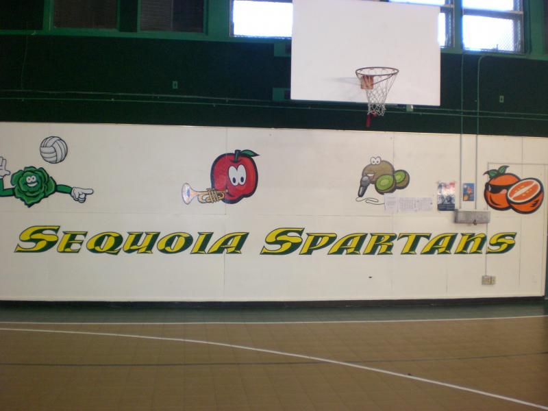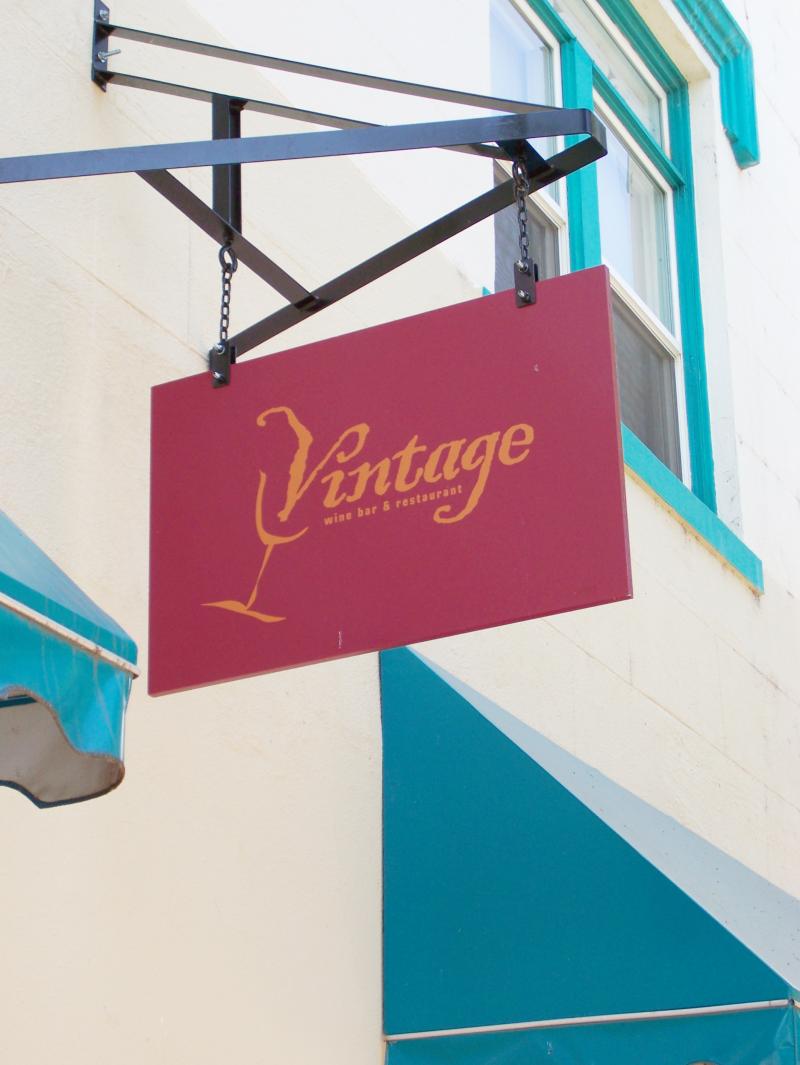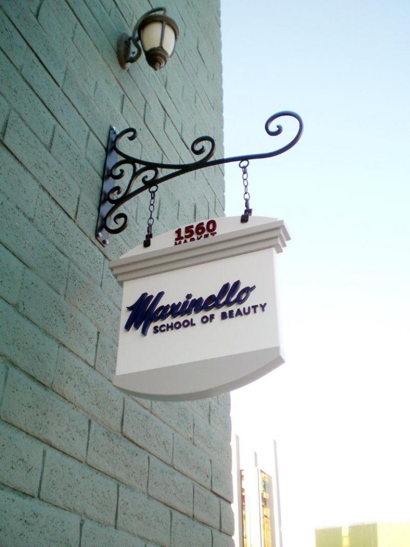 Hand painted flourish pattern on stucco wall. Signs are MDO custom shaped with prints and cut vinyl decoration.