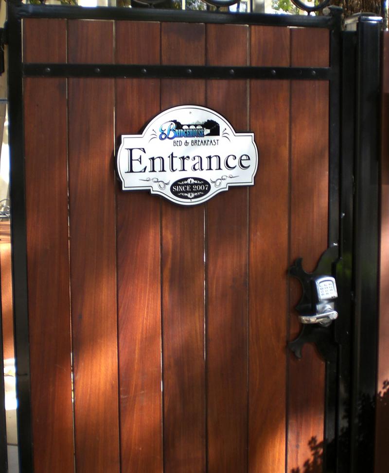 Brushed aluminum panel custom curved for monument with sign vinyl decoration and aluminum standoffs for mounting to concrete.